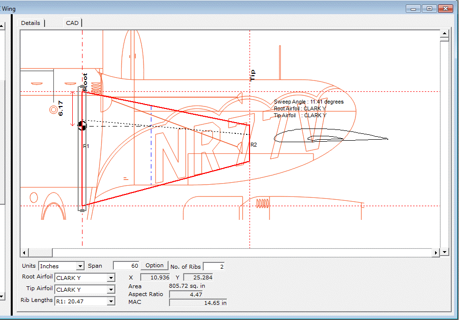 This is done by setting the span to the appropriate size. Moving the mouse over the CAD pane so that it is over the furthest extremity of the tip gives an X value of 81.496 inches. This is the distance from the centerline to the wing tip.